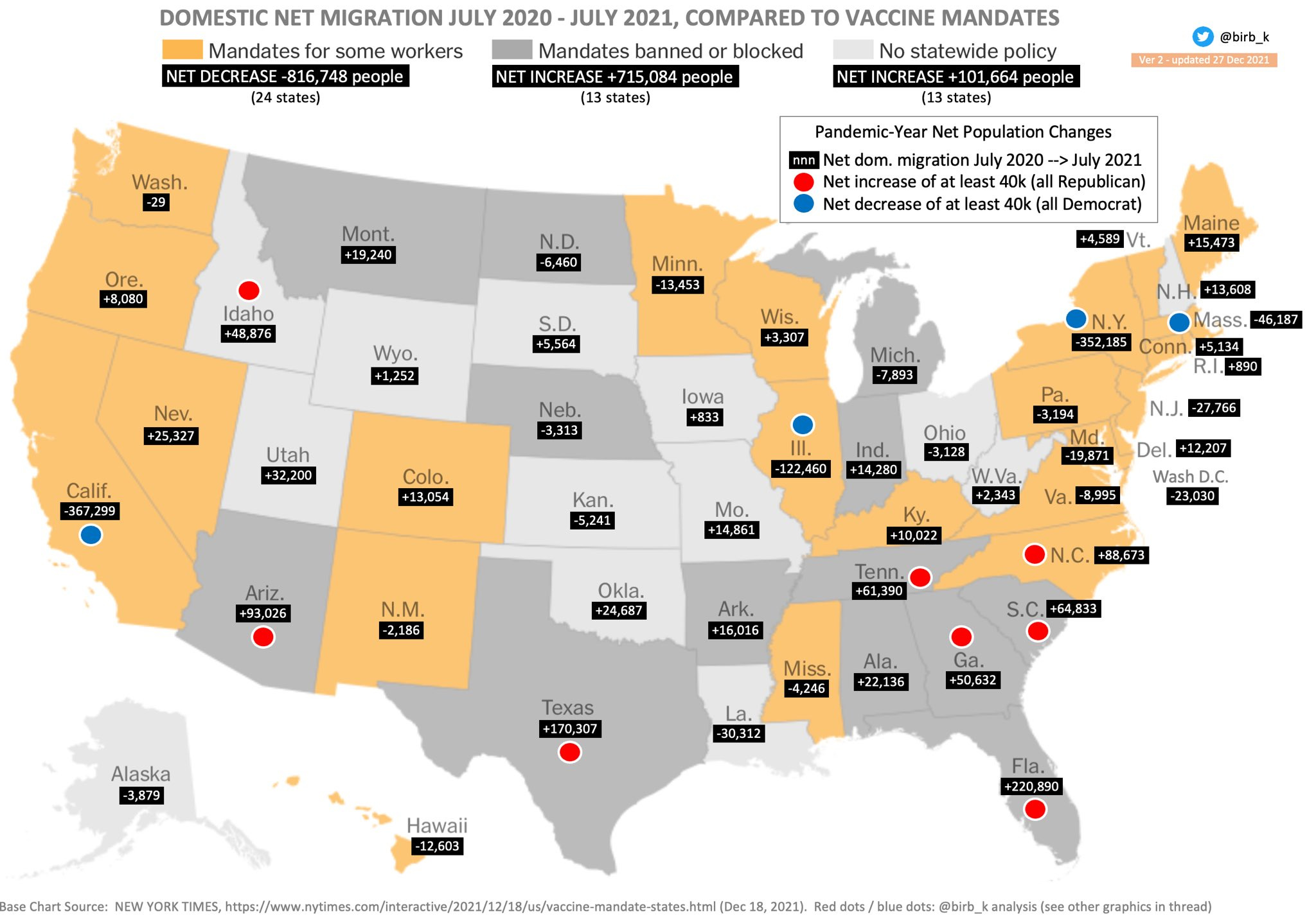 Chart 3/10. Net migration vs. vaccine mandates. 13 states that have banned/blocked mandates received net increase of nearly three-quarters of a million people. Conversely over 800K people no longer call states home that have vaccine mandates. Base map NYT. Black/blue/red mine.