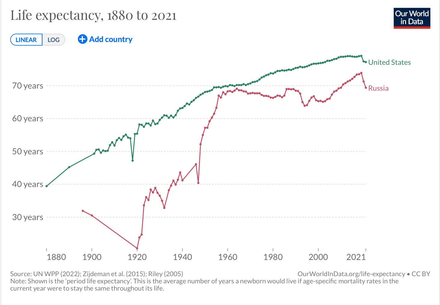 None of this could ultimately hide the vital statistics, which, Yuri explained, truly do tell the story. From 1920 to 1960, life expectancy did increase dramatically though never quite reaching asat high as the US. But after 1960, it began to decline even as it was rising more and more in the US and in non-communist countries around the world. This continued until the regime finally collapsed, at which point life expectancy began to rise again.
