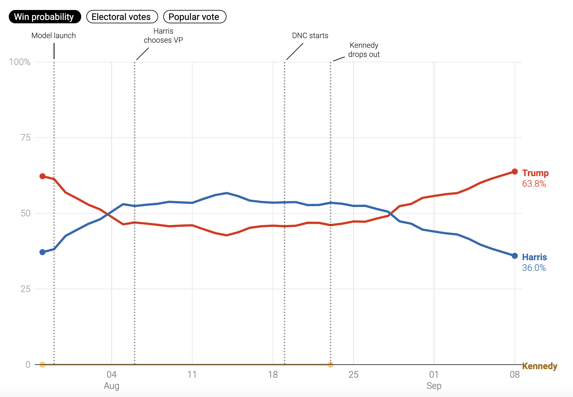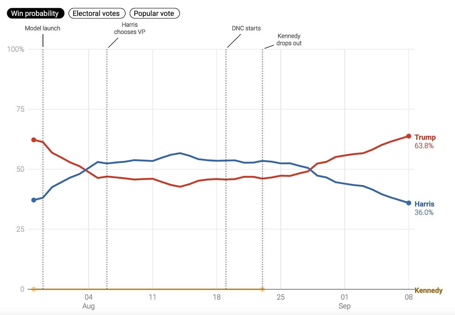 Back to Pennsylvania: If Trump wins this state, Silver’s model gives him a 93.8% chance of winning the election. For Trump, winning Pennsylvania is like holding pocket Kings—a powerful hand that significantly boosts his chances. Harris, on the other hand, needs to win other key states, like Michigan or Georgia, to balance out her losses, similar to a poker player playing multiple lower-value hands to win over time.