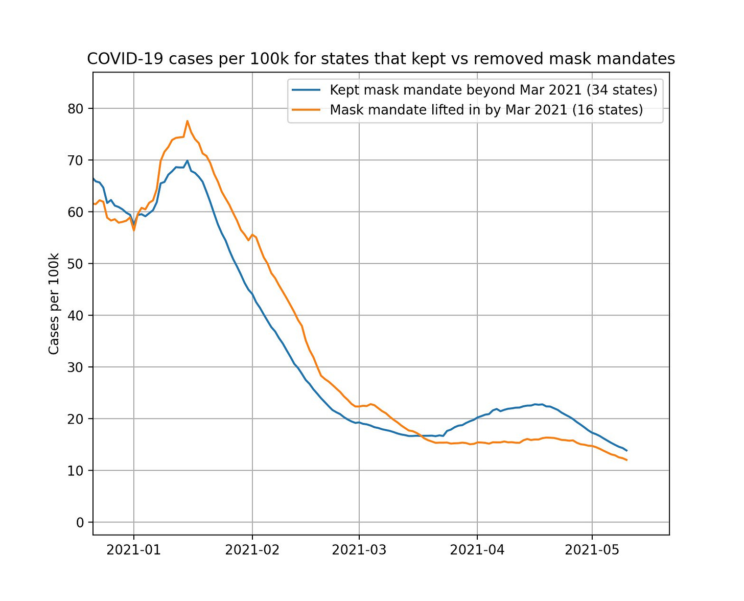 Meanwhile, it is in the process of ending. Case rates, hospitalizations and deaths are down all across the country. In California, the case rate is 4 per 100,000 with a 1% positive test rate. New York’s numbers are almost as good. A combination of natural and vaccinated immunity—60% of the adult population will have received at least one shot by the end of this week—is bringing this virus to its knees.