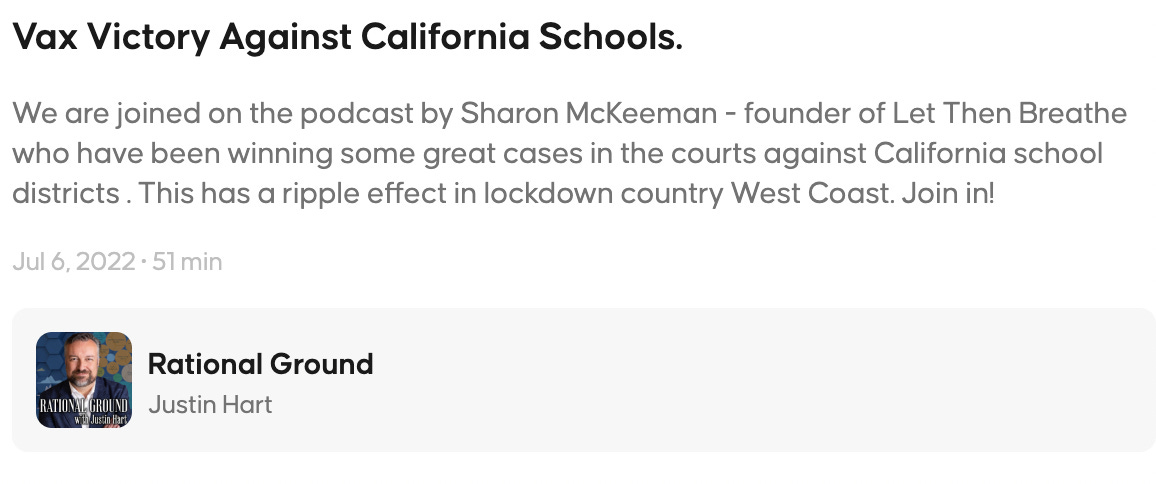 ICYMI: we had a great conversation with Sharon McKeeman, the founder of Let Them Breathe yesterday. Short version: numerous groups in Southern California have been successful in thwarting mask and vax mandates for public school students.