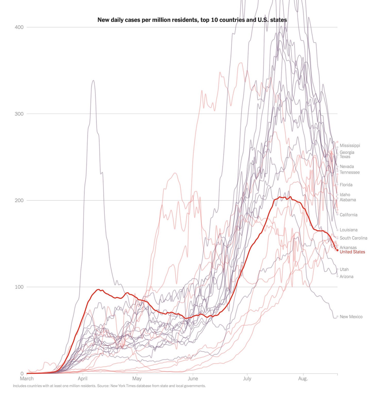 New Daily Cases Per Million Residents, Top 10 Countries and U.S States