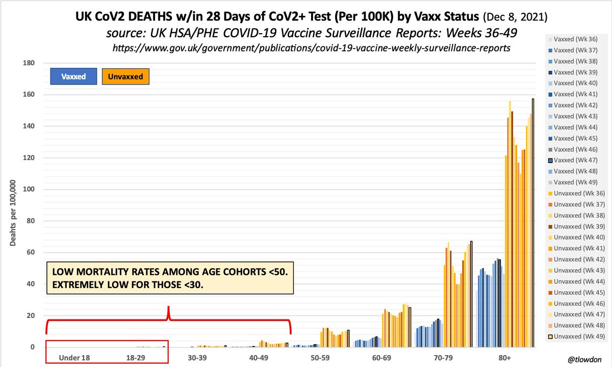 The same UK HSA report continues to show apparent VE in reducing hospitalization and death risk. However, the mortality risk following a CoV2+ test for anyone <50 remains extremely low & the risk to those <30 is effectively zero. Again, vaxx mandates are unwarranted.