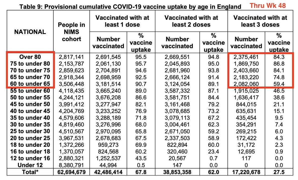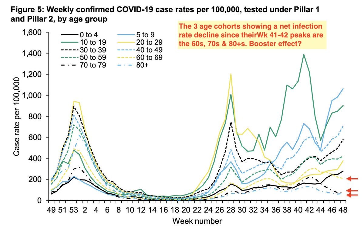 You can see the possible booster effect in the decline in infection rates, since their Wk 41-42 peaks, in the 60-69, 70-79 & 80+ age cohorts. Each is now above 59% boosted and these cohorts are the only ones showing recent declines.