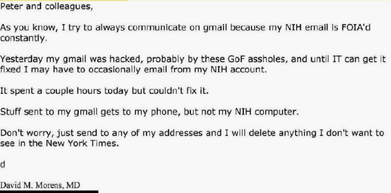 Alarmingly, this action is in direct contradiction with the line below Morens' signature in his emails which urges, “IMPORTANT: For US-government related email, please also reply to my NIAID address.” This flagrant disregard for transparency is made all the more disconcerting by the fact that Morens has been a pivotal figure at NIH for 25 years.