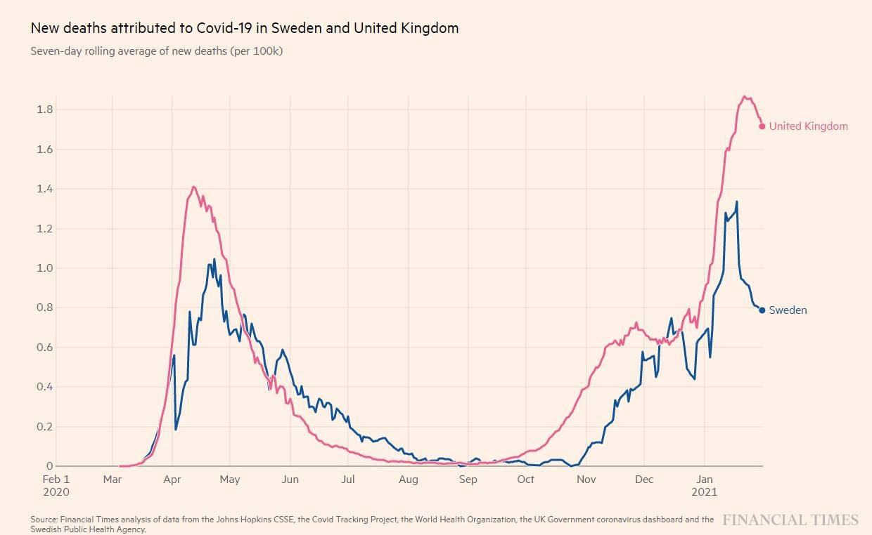 Economist Phil Magness: “It turns out that the UK and Sweden followed a similar pattern during both waves of the pandemic. They differed in levels of intensity, with the UK doing worse during both waves. This occurred despite the two countries taking completely opposite approaches to mitigation. At the end of the day, the lockdowners are going to have to explain how their favored policies yielded a worse outcome than seen in a country that rejected those policies despite having a parallel outbreak pattern.”