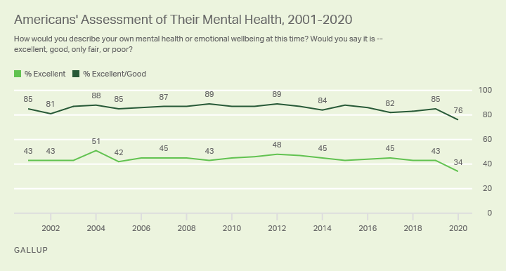 Each year since 2001, Gallup has asked Americans as part of its November Health and Healthcare survey to say whether their own mental or emotional wellbeing is excellent, good, only fair or poor. The reading for those rating their mental health as excellent or good ranged from 81% to 89% until this year's 76%.