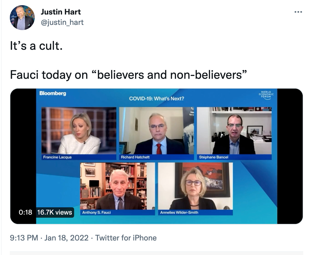 Yesterday, an all-star line-up of health overlords and pharma grifters were on a panel with the high priest of The Science, Dr. Tony Fauci. If you think I’m laying on the metaphors too thick just get a load of this clip from his appearance at the World Economic Forum yesterday: