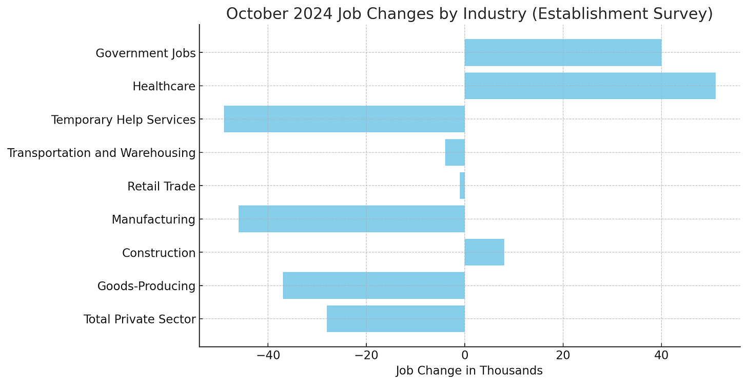 The latest employment report underscores this reality, with just a meager 12,000 jobs added in October 2024—and that’s largely thanks to government hiring. If not for the 40,000 new government jobs, these numbers would look even worse.