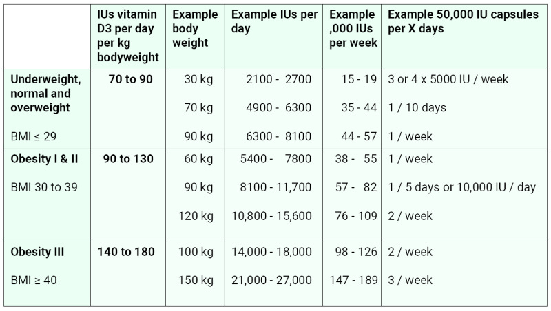 He also recommended 70 IU vitamin D3 / kg BW / day for age 18 years and younger (with no correction for obesity) and lower ratios for underweight adults.