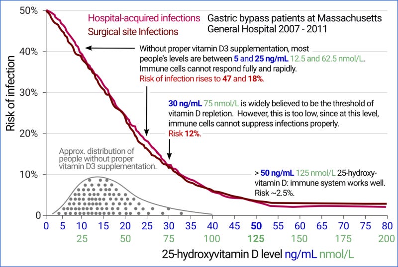 For those patients with 50 ng/mL or more circulating 25-hydroxyvitamin D (which would have been attained largely or entirely by proper vitamin D supplementation), the risk of hospital acquired and surgical site infections, separately, were about 2.5%. 20 ng/mL is a perfectly ordinary level for someone who does not supplement vitamin D3 much or at all and who has not recently had extensive UV-B skin exposure (or who has, but on dark or black skin). The Boston hospital research shows that such people have a 24% chance of each type of infection.