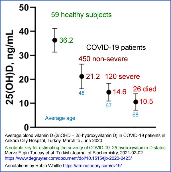 A February 2020 article by Tuncay et al. investigated the 25-hydroxyvitamin D levels of 596 PCR-positive COVID-19 infected patients and 59 healthy individuals in Ankara City Hospital, Turkey, from March to June 2020. This annotated version of their Fig 1 illustrates the strong, statistically significant (p < 0.001) relationship between low 25-hydroxyvitamin D levels and disease severity.