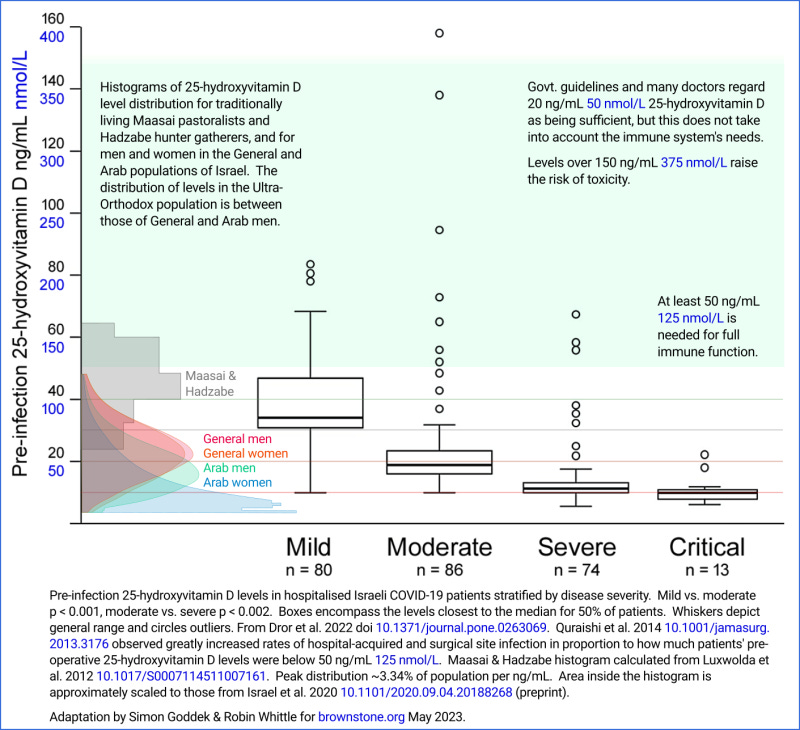 We can see from the histogram of 25-hydroxyvitamin D levels in the graph at the start of this article (from Israel et al. 2020) that even in sunny Israel, a significant fraction of the population – especially Arab women – have 25-hydroxyvitamin D levels in the 5 to 10 ng/mL range, 1/10th to 1/5th of what their immune system needs. At 5 ng/mL, the Boston hospital risk for both hospital-acquired and surgical site infections rises to 47%.