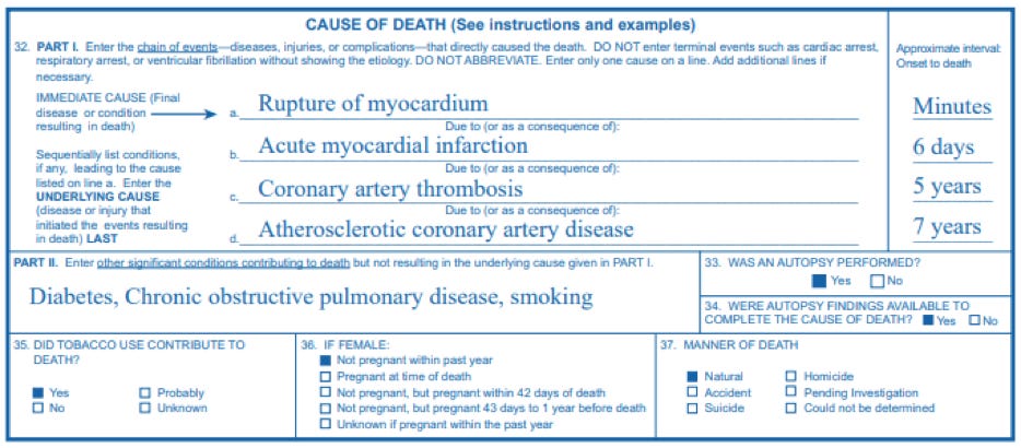 The Centers for Disease Control and Prevention (CDC) has a Physician’s Handbook on Medical Certification of Death that provides guidance to certifying physicians and medical examiners; the goal is that anyone not involved with the deceased or the event can read the report and clearly understand what led up to the death. The certificate has a clear “manner of death” by category (e.g., natural, homicide, accident, etc.). PART 1 should describe the chain of events that directly caused the death. Line a should be the immediate cause of death, followed by the events that result from the underlying cause, which is listed last. Here is an example from the CDC instructions: