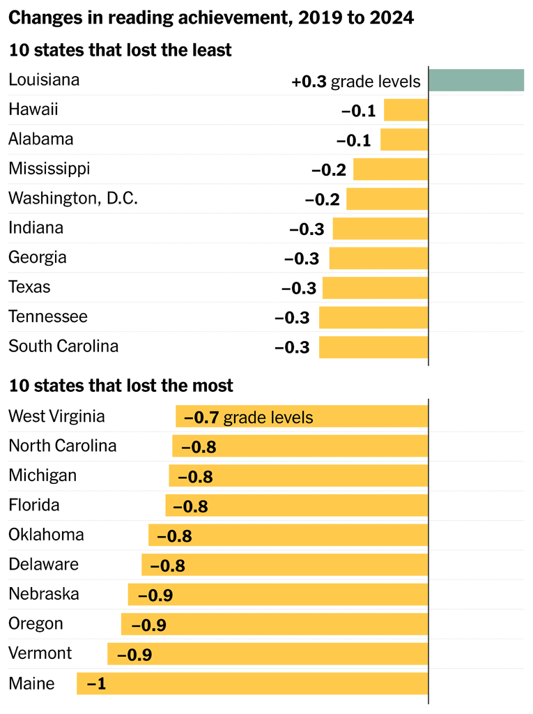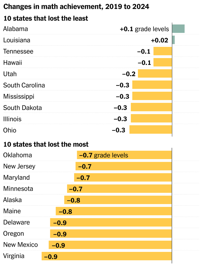 I’m in Louisiana and I find it interesting that Louisiana scores WENT UP (a little) rather than down. I wonder whether this shows Louisiana schools actually HINDER education, so closing schools down led to an improvement in scores. 🤔