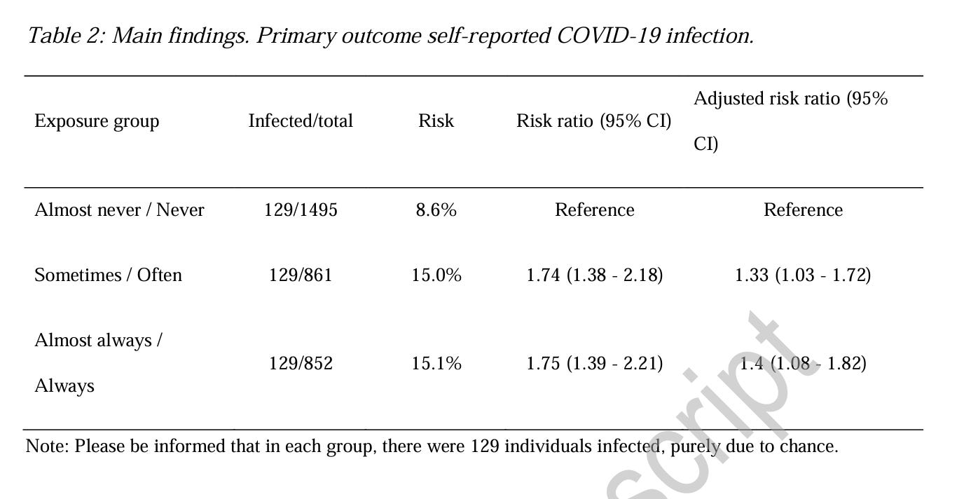 We found that the incidence of self-reported 6 COVID-19 was 33% (aRR 1.33; 95% CI 1.03 - 1.72) higher in those wearing face masks 7 often or sometimes, and 40% (aRR 1.40; 95% CI 1.08 - 1.82) higher in those wearing face 8 masks almost always or always, compared to participants who reported wearing face masks 9 never or almost never.