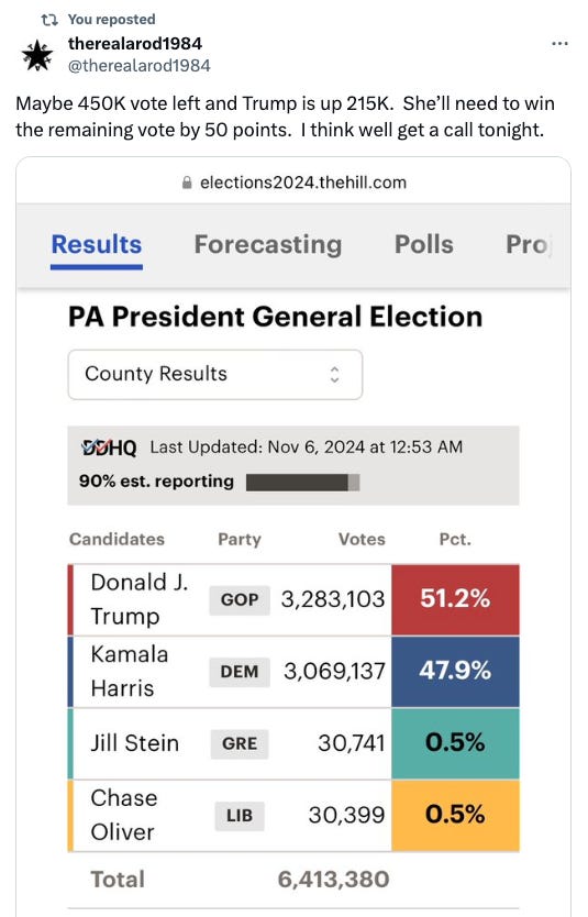 ”Maybe 450K vote left and Trump is up 215K. She’ll need to win the remaining vote by 50 points. I think well get a call tonight.”