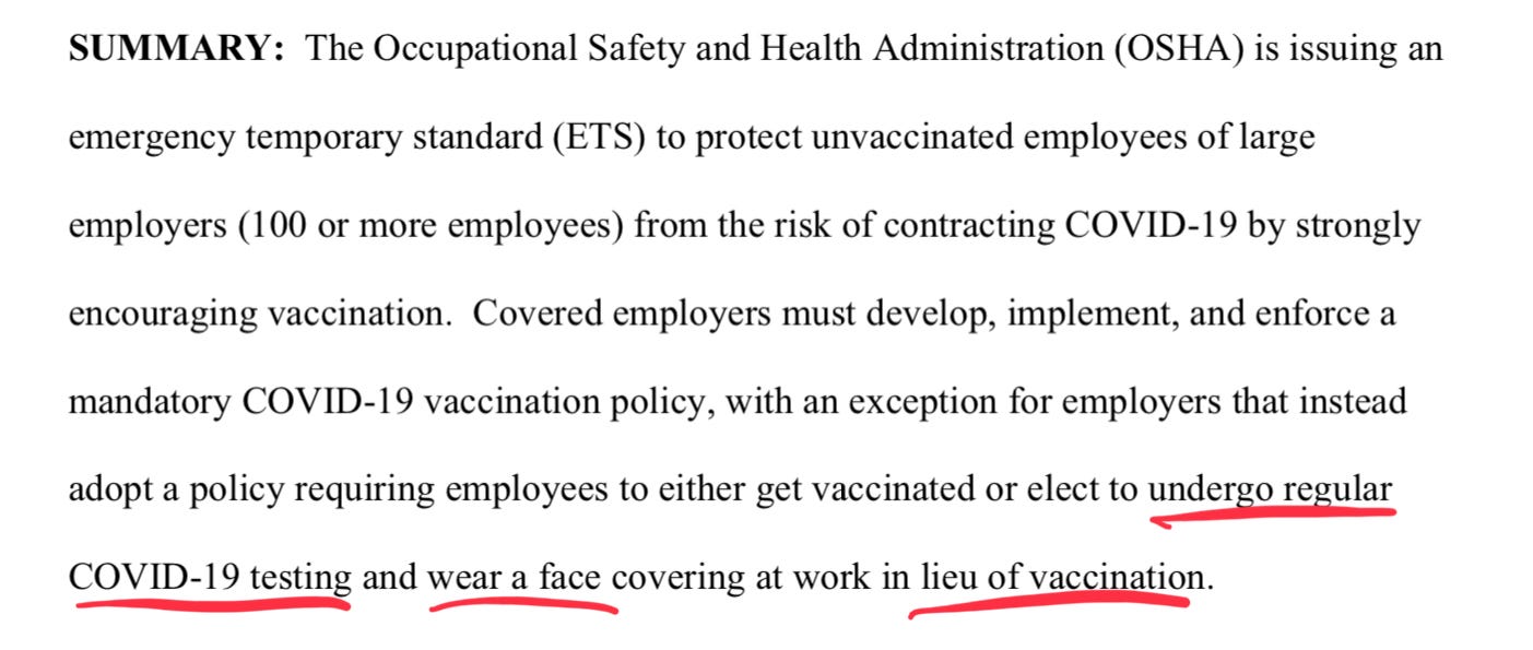 1) So if you won’t get vaccinated you’ll have to wear a mask and get tested regularly. This is how they frame it RIGHT at the beginning to make it clear that they will be in compliance with what SCOTUS has allowed in recent months. Options… always give the illusion of options to get your regulation through and then hammer them. Regular testing is just humiliation to get people to comply.