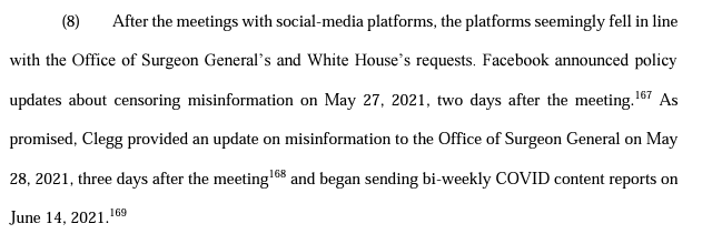 8/ In response to these meetings, social media platforms complied with the requests of the Office of Surgeon General. They began announcing policies on censoring misinformation, reporting to federal officials, and even endorsing Murthy's call to crack down on "poison".