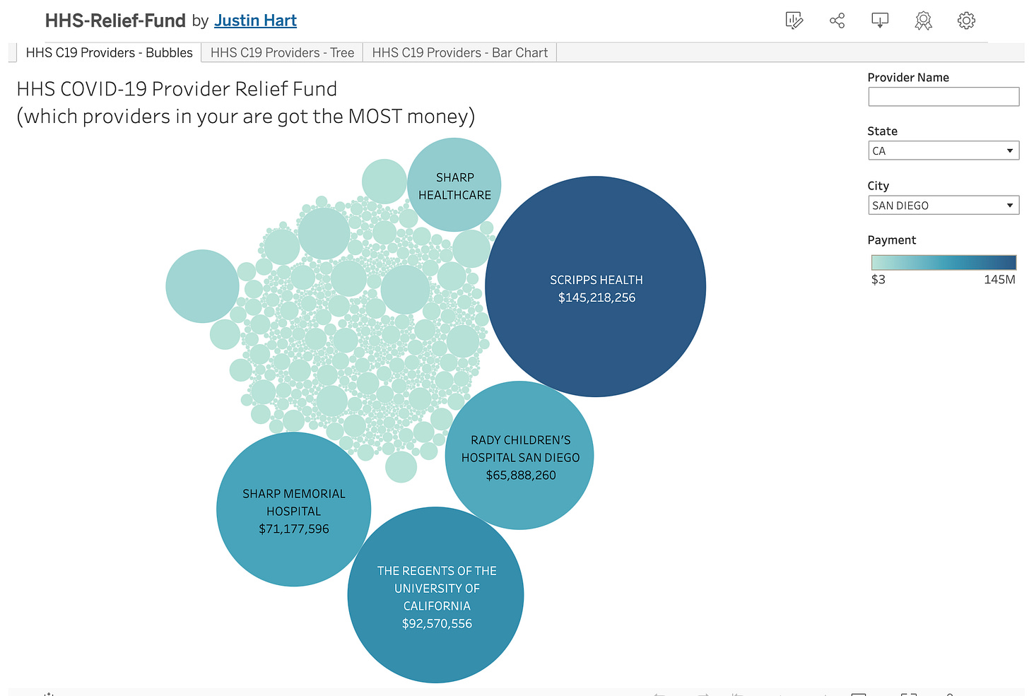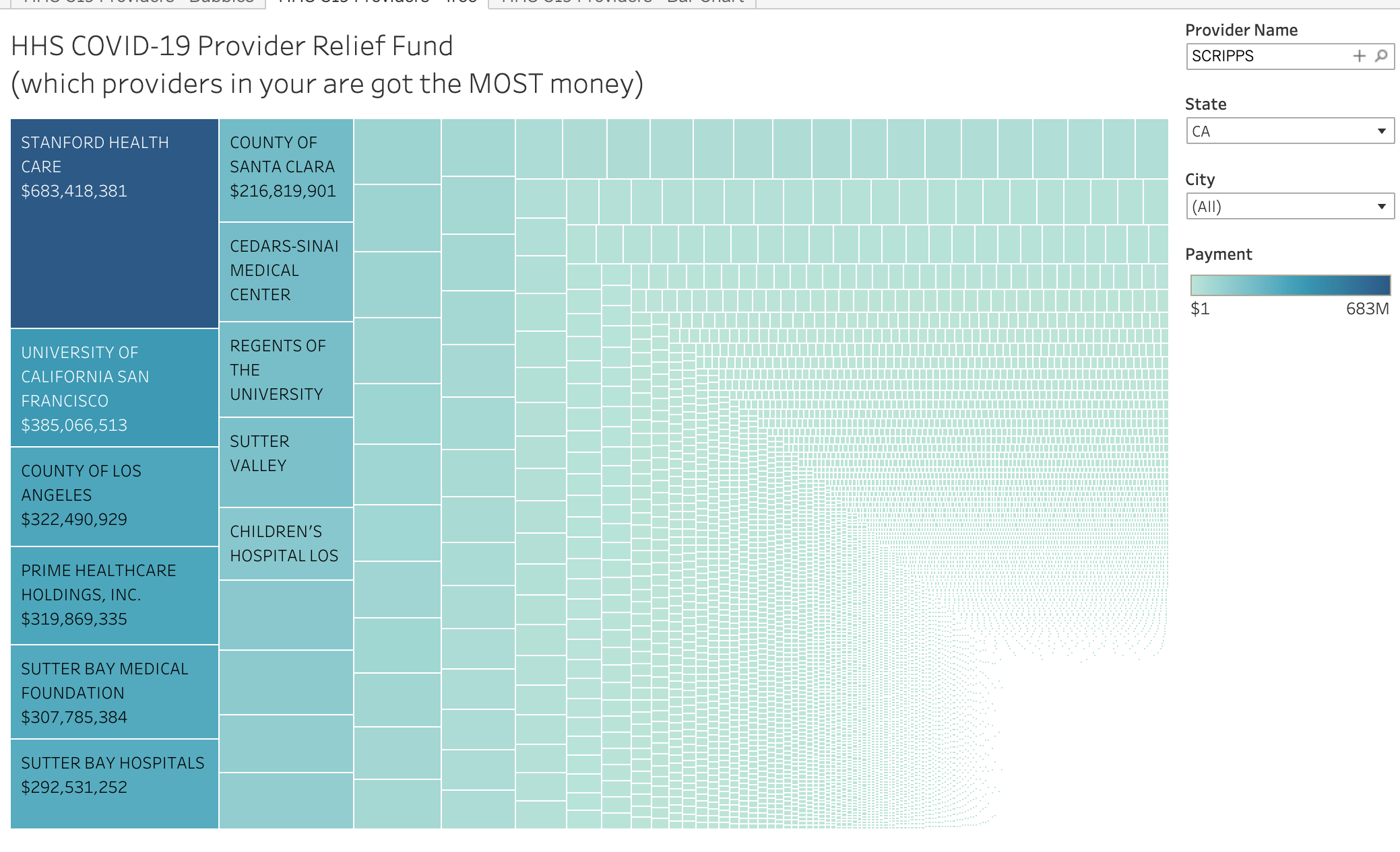 I’ve created a set of interactive charts so that you can get a quick glance into which medical providers received the MOST money from the HHS COVID-19 Provider Relief Fund.