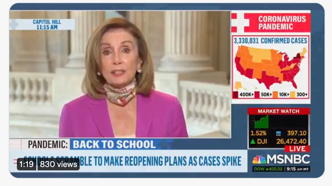 Pelosi, July 13, 2020: "The biggest risk to the spread of the pandemic is opening up the schools ..."