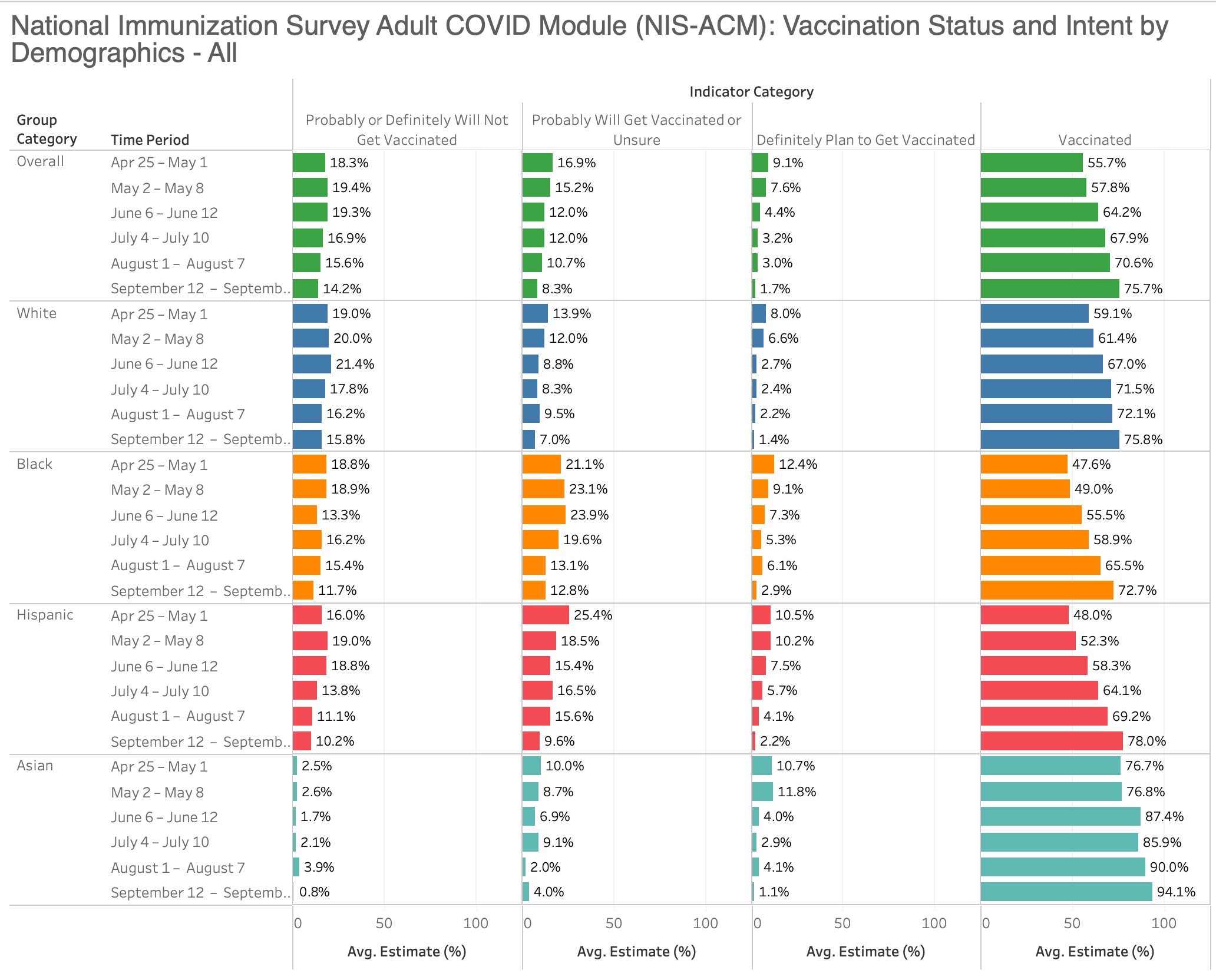 Interesting that the mean difference between blacks, whites and hispanics is not that large but it seems like Hispanic hesitancy is moving more downwards. Blacks on the other hand have moved hesitation into the “Probably Will Get Vaccinated” category.