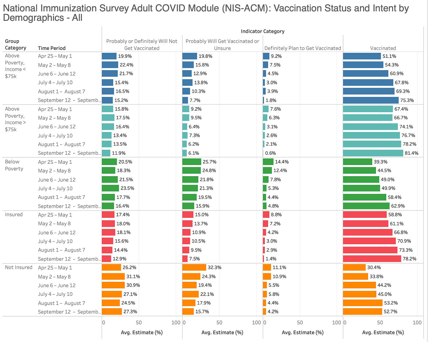 This is taken from the weekly NCIS survey and you can see that they seem to have convince about 5% of people to move from the “Probably or Definitely Will Not Get the Vaccine” category over 6+ months.